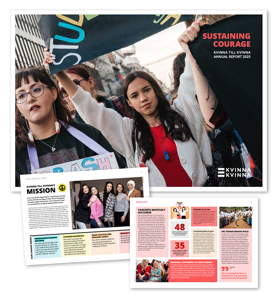 The Kvinna till Kvinna Foundation is one of the world’s leading women’s rights organisations, working in 20 countries affected by war and conflict. Our mission is to contribute to an equal and peaceful world.